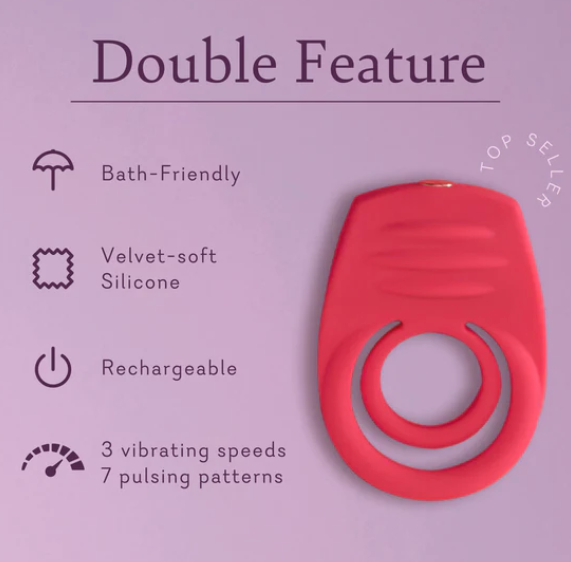 Double Feature is one of our most loved c-rings and for good reason. With two flexible silicone rings designed to wrap around the shaft and testicles, this toy offers snug, pleasure-enhancing pressure that intensifies erection and sensation. Add in a 10-function clitoral massager that delivers powerful vibrations, and you’ve got a show-stopping performance you’ll both feel.