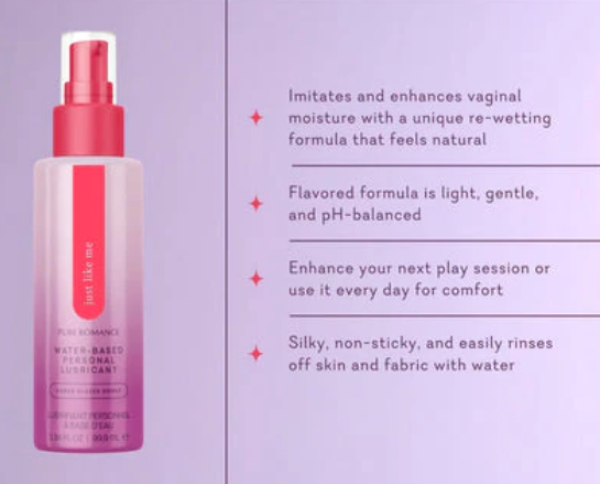 Just Like Me is a light, water-based, and pH-balanced lubricant designed to mimic natural vaginal moisture perfectly. Ideal for intimate moments or everyday use, it enhances comfort and pleasure without irritation. Apply as needed and enjoy smooth, natural-feeling glide anytime.